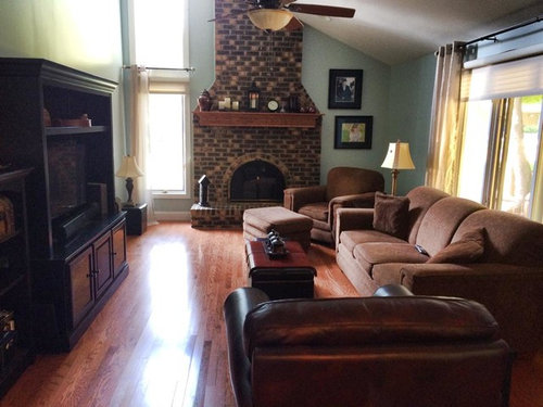 I am struggling with how to arrange this room now that we have painted the walls. I have to keep the brown couch and perhaps the brown leather chair and would like to bring in two bent wood arm recliners in a sand color.